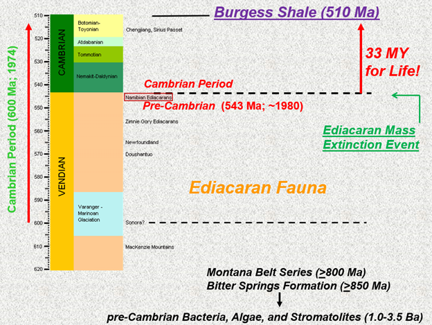 Figure 2.  Geologic column showing age of Burgess Shale (510 Mya) relative to the end of the Vendian Pre-Cambrian period (543 Mya).  Only 33 My are available before the diverse Cambrian ecology displayed in the Shale.
