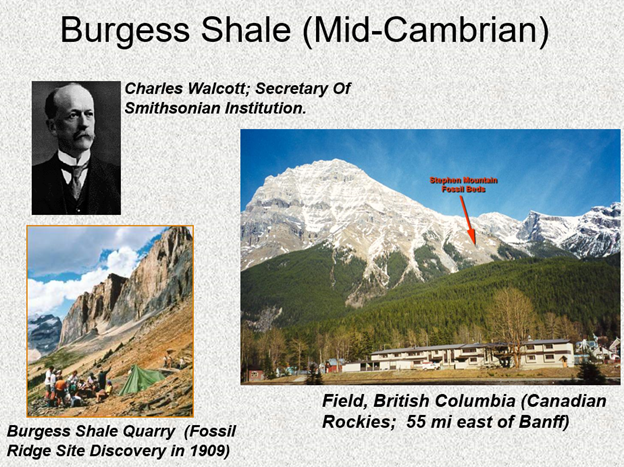 In 1909, Charles Walcott (Secretary of the Smithsonian Museum) discovered what became a world-famous fossiliferous section in mountainous terrain about 55 miles west of Banff, near Field, British Columbia (Fig. 3).2 The fossils occurred in several stacked intervals (strata) of shale at the foot of an ancient reef system (Fig. 4).  Mud slides along the face of the reef delicately buried the Cambrian creatures in anoxic sediment and provided extremely fine preservation details (referred to as a “Lagerstatten” deposit; see Appendix 1).