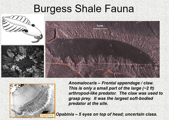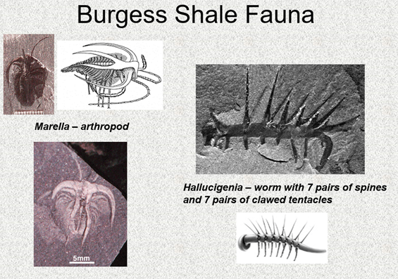 Figure 5.  Examples of Burgess Shale Fauna—Anomalocaris, Opabinia, Marella, and Halluceginia