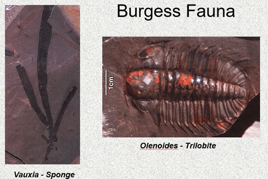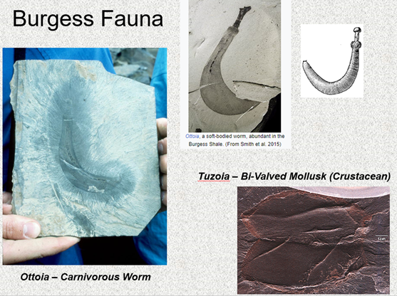 Figure 6.  Examples of Burgess Shale Fauna—Ottoia, Tuzola, Vauxia, and the trilobite Olenoides.