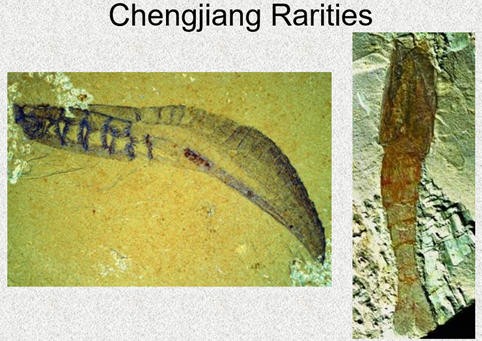 The Chengjiang fauna offers a more direct glimpse (than the Burgess Shale— JRC) of the taxonomic diversity, morphological complexity and ecological prosperity of life on Earth perhaps at the end of the “Cambrian Explosion” interval.  It provides critical evidence of the first results of the “Cambrian Explosion” and has dramatically expanded our knowledge of the formative interval.  The fauna also indicates a number of animal phyla came into being during this interval, almost at the same time.  Despite this, there is no reason to think of large numbers of big leaps in the evolution (??? – JRC).  There must have been a large number of empty prospective niches, and some factor in the environment, perhaps a rise in oxygen pressure, suddenly made it possible for animals to adapt to all these niches, developing different body designs and lifestyles…