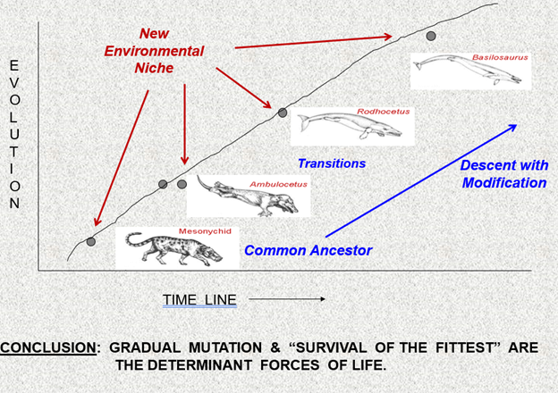 Finally, Darwin’s model of gradual, evolutionary change should be evident in the fossil record.  Paleontologists (scientists that study fossils) anticipate and search for these trends within basinal sediment.  Figure Appndx 1 displays the slow, evolutionary change that was suggested for sea mammals through much of the 20th century.  Figure Appndx 2 demonstrates how the trend might be assembled through the fossil assemblages from several basins.