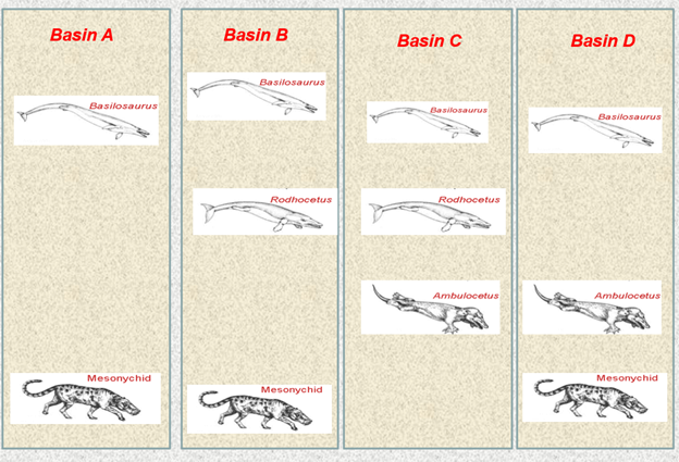 Figure Appndx 2.  Example of how the evolutionary sequence for whales might be constructed from incomplete records in several basins.  A complete sequence is rarely identified within the deposits from a single basin.