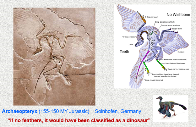 Transitional fossils are considered the highly prized and strongest paleontological evidence of evolutionary change.  Archaeopteryx fossils from ancient German lake sediment deposits (Figure Appndx 3) have long been considered the physical “proof” of an evolutionary transition from reptiles to birds.  Since then, 12 other specimens have been discovered.  There is currently much debate on its true identity – bird or dinosaur.  Many researchers lean toward the latter. App1