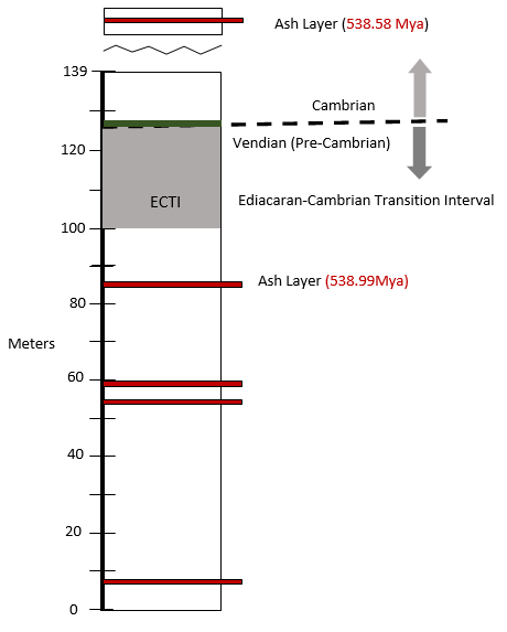A simplified version of the site’s stratigraphic column is included in Figure 10 (the original, detailed column is included in the article).12 The uppermost Vendian strata include five small ash intervals, and the respective Ediacaran fossils are identified in the intervening strata.  The Ediacaran fossils begin to disappear near the top of the Vendian sequence in an interval that the authors term, “Ediacaran-Cambrian Transition Interval (or, ECTI; Figure 10).  The ECTI also includes the earliest traces of Cambrian life; whereas the interval just above the ECTI includes the sudden appearance of complex, bilateral Cambrian organisms identified from complex worm traces (the Namibian site was a higher-energy environment—no soft-body fossils are available; worm tracks that are diagnostic of the Early Cambrian were used to identify the boundary).