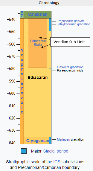 The Vendian period marked the first appearance of multi-cellular organisms in the fossil record.  The Ediacaran sub-group appeared within the Vendian about 0.6 Bya (600 Mya; Figure 1); it included the most abundant assemblage of organisms.  As noted in Part 7, they were relatively simple.  They had no circulatory system, brain, or other organs found in advanced lifeforms.  Some vaguely resembled today’s coral-type animals, many others were unique.